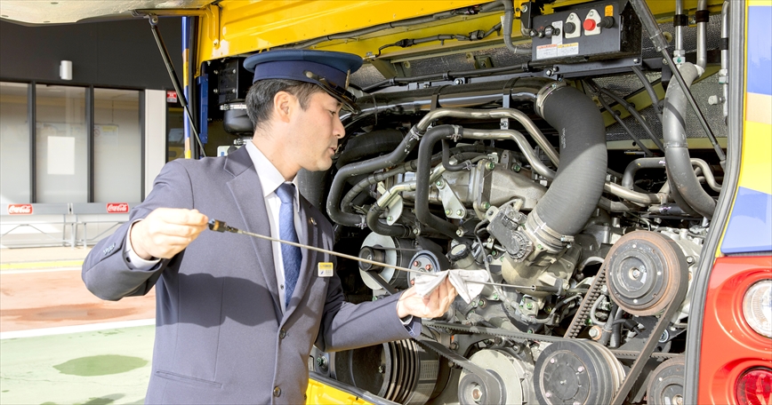 乗務前には、タイヤやエンジンベルト、オイルなど車両の状態を丁寧に点検し、点呼やアルコールチェックを受けて安全運行に臨みます。目的地に到着後は、次の運行に備えてしっかりと休憩を取り、帰路も安全第一で運転します。